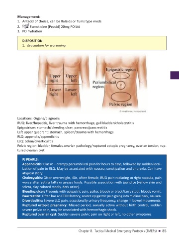 Epigastrium: stomach/bleeding ulcer, pancreas/pancreatitis