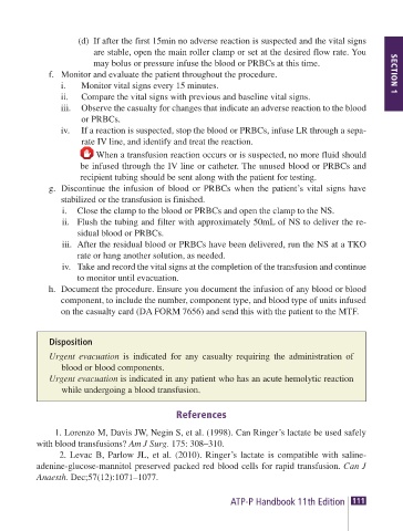 iv. If a reaction is suspected, stop the blood or PRBCs, infuse LR through a sepa-
