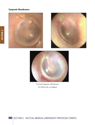 Tympanic Membranes SECTION 2 Normal Tympanic Membrane (No fluid levels, no bulging) 214 SECTION 2 TACTICAL MEDICAL EMERGENCY PROTOCOLS (TMEPs) ATP-P Handbook 11th Edition 215