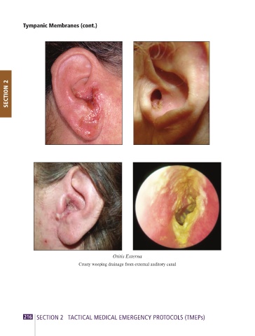 Tympanic Membranes (cont.) SECTION 2 Otitis Externa Crusty weeping drainage from external auditory canal 216 SECTION 2 TACTICAL MEDICAL EMERGENCY PROTOCOLS (TMEPs) ATP-P Handbook 11th Edition 217