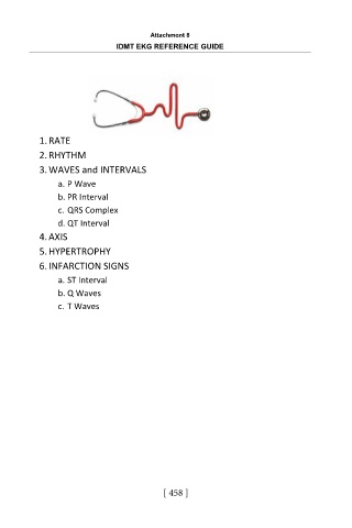 Attachment 8 IDMT EKG REFERENCE GUIDE 1. RATE 2. RHYTHM 3. WAVES and INTERVALS a. P Wave b. PR Interval c. QRS Complex d. QT Interval 4. AXIS 5. HYPERTROPHY 6. INFARCTION SIGNS a. ST Interval b. Q Waves c. T Waves [ 458 ]