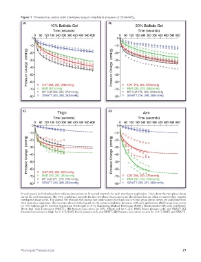 Pressure-loss curves on thigh for C-A-T, RMT, blood pressure cuff, and SWATT. (D) Pressure-loss curves on arm for C-A-T, RMT, and SWATT.