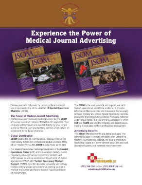 Global Distribution advertising space is limited, increasing your visibility to Publisher of the Journal of Special Operations Medicine