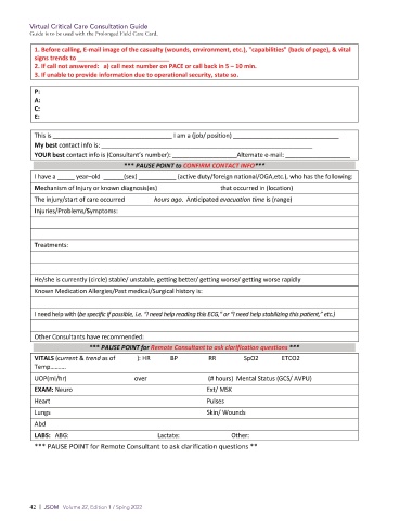 Virtual Critical Care Consultation Guide Guide is to be used with the Prolonged Field Care Card. 42 | JSOM Volume 22, Edition 1 / Sping 2022