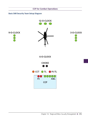 CCP for Combat Operations Basic SAR Security Team Setup Diagram 12-O-CLOCK 9-O-CLOCK 3-O-CLOCK 6-O-CLOCK CHOKE CCT TL PJ-TL PJ A&L CCP Chapter 14. Triage and Mass Casualty Management n 191