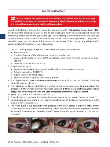 Lateral canthotomy is indicated for casualties presenting with: Retrobulbar Hemorrhage (RBH)