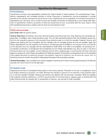 Tactical Field Care: All attention should be directed towards preventing heat loss. Stop bleeding and resuscitate ap- SECTION 3