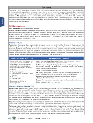 Tactical Field Care/Tactical Evacuation: If a penetrating eye injury is noted or suspected: Perform a rapid field test of